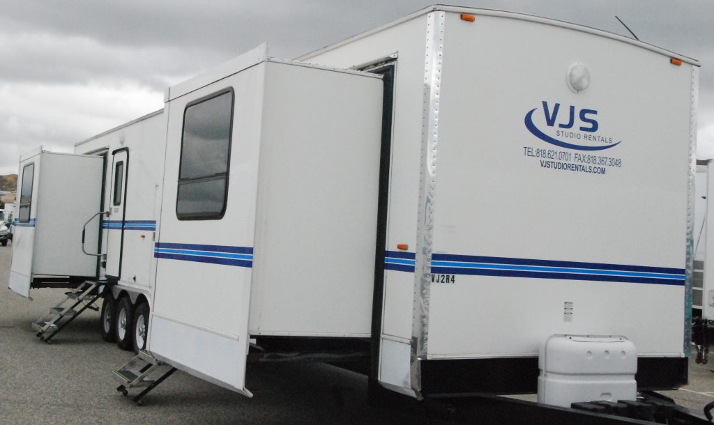 Keep your talent happy and comfortable with all the amenities in this forty foot 2 room trailer with pop-outs and showers! Two identical rooms, each with: Fully lighted, extra-large makeup stations, color TV/VCR, fold-up table, AM/FM/Cassette stereo, refrigerator, microwave, stove, fold out sofa, heat and air conditioning.